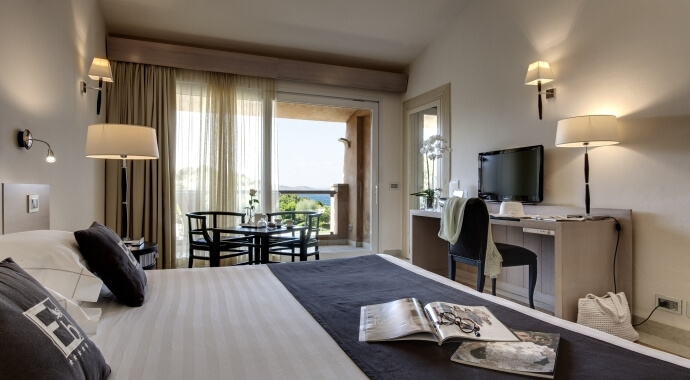 Ampie e luminose, uno spazio di circa 35 m² dove ritrovare armonia e risvegliarsi pensando ai profumi inebrianti della Sardegna. Le ceramiche sarde del bagno spazioso contornano la splendida vasca per idromassaggio e cromoterapia, oltre a una doccia con soffione. La camera dispone di aria condizionata, smart TV 55”, minibar e macchina per espresso, menu cuscini, luxury courtesy set e wi-fi gratuito.